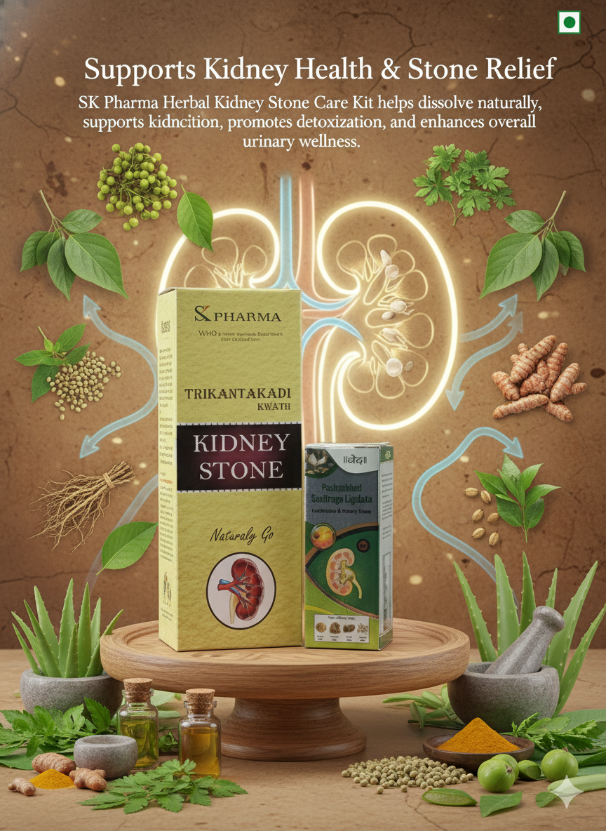 Kidney stone sirf ek normal problem nahi hai, balki agar time par treatment na mile to ye severe pain, urinary infection, kidney damage aur surgery tak ka risk badha sakti hai. Isi problem ka natural aur surgery-free solution hai SK Pharma Kidney Stone Kit, jisme Trikantakadi Kwath aur Pashanbhed based Ayurvedic Stone Dissolver shamil hai.